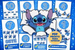 Encante as crianças com o Cartaz de Parede dos Números de 1 a 10 com o tema Stitch! Ideal para Educação Infantil, com cores vibrantes